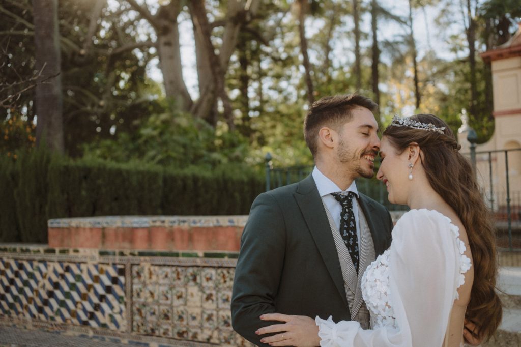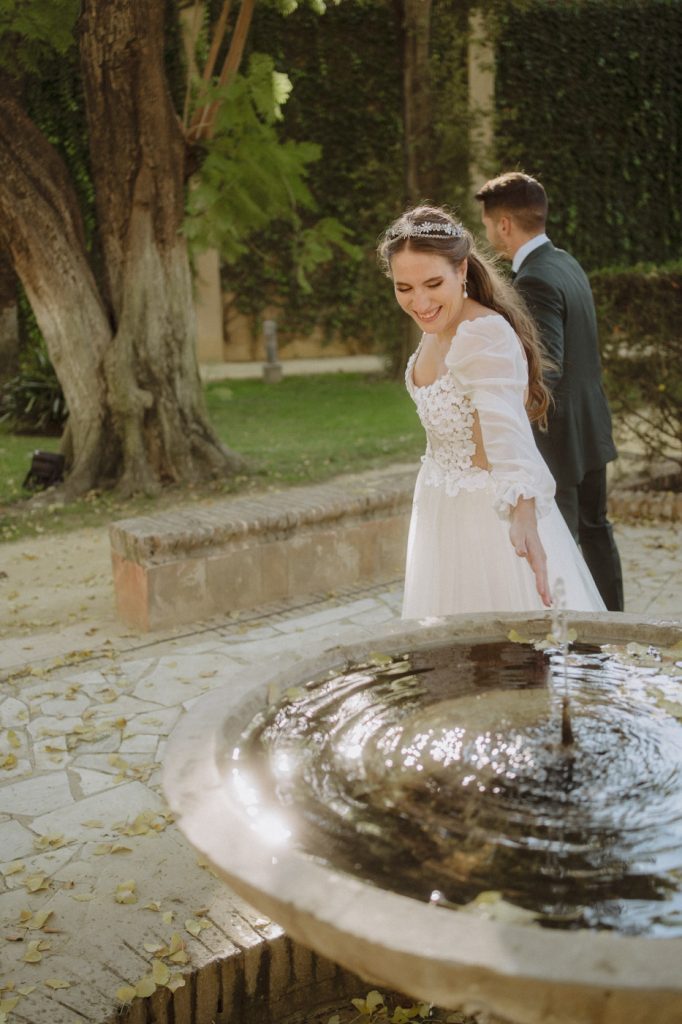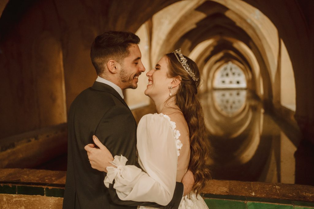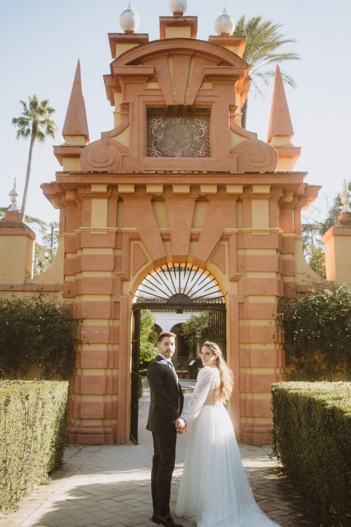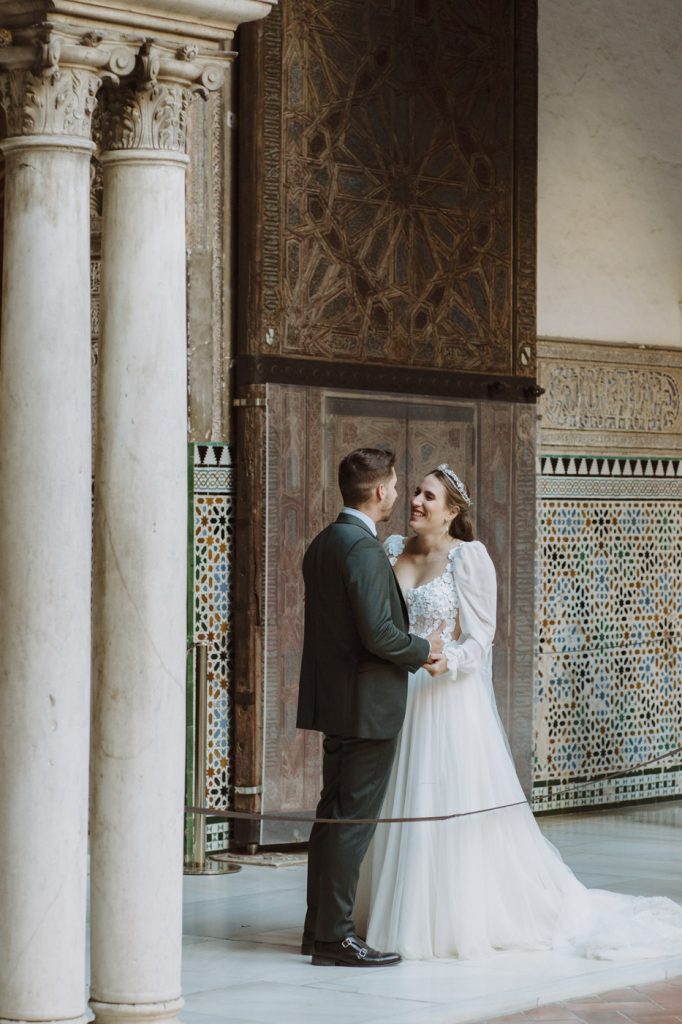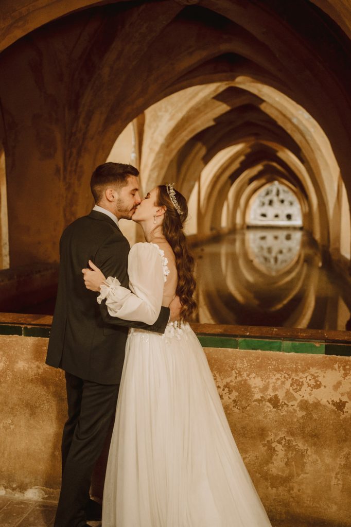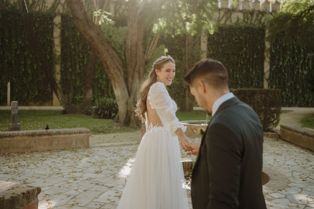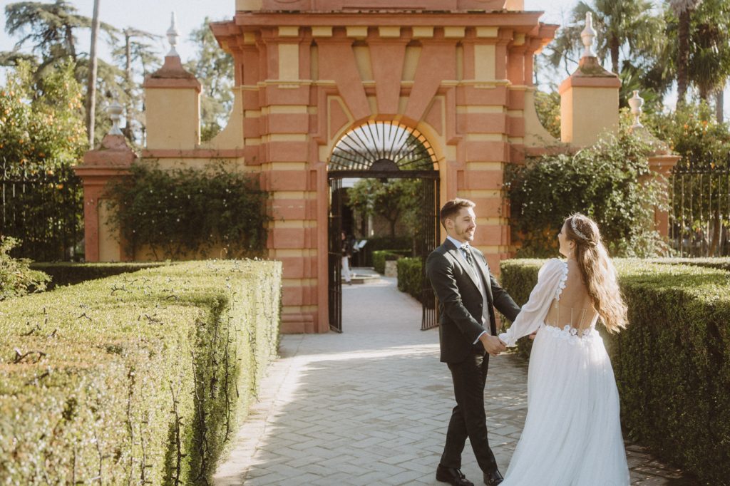 Mucha gente duda en si hacer postboda o no, la consideran prescindible, ya que el día de la boda ya tienen muchas fotos vestidos de novios y es verdad, pero no es lo mismo para nada. Pensad en el dineral que os gastáis en ese vestido y ese traje, para usarlos solo un día en la vida… menos incluso, unas horas. Además en la boda muchas veces tenemos muy poquito tiempo para fotos. Es normal, no queréis perderos mucho tiempo del cocktail porque quereis comer y estar con vuestros seres queridos, es comprensible. Además muchas veces la luz es la que toque y el entorno a veces puede ser demasiado limitado. Las postbodas merecen la pena porque os permite por un lado, volver a tener la oportunidad de lucir el vestido y el traje, (antes de guardarlo para la posteridad) y haceros fotos con total tranquilidad, en un sitio bonito de vuestra elección, a una hora en la que la luz va a ser perfecta para que salgan espectaculares. Es un recuerdo que sin duda merece la pena tener y salen fotones que os encantará tener. Si me preguntáis, la postboda es sin duda un rotundo SÍ. Y así lo demuestran las fotos de a continuación. Y encima si elegís el Alcazar de Sevilla como Alba y Javi, el éxito está asegurado, ya que es un sitio precioso y lleno de rincones fotogénicos.