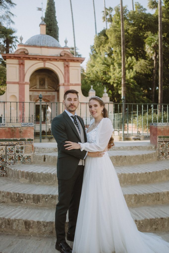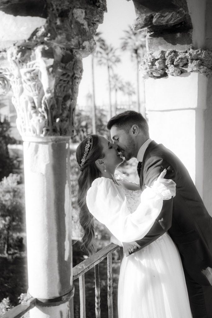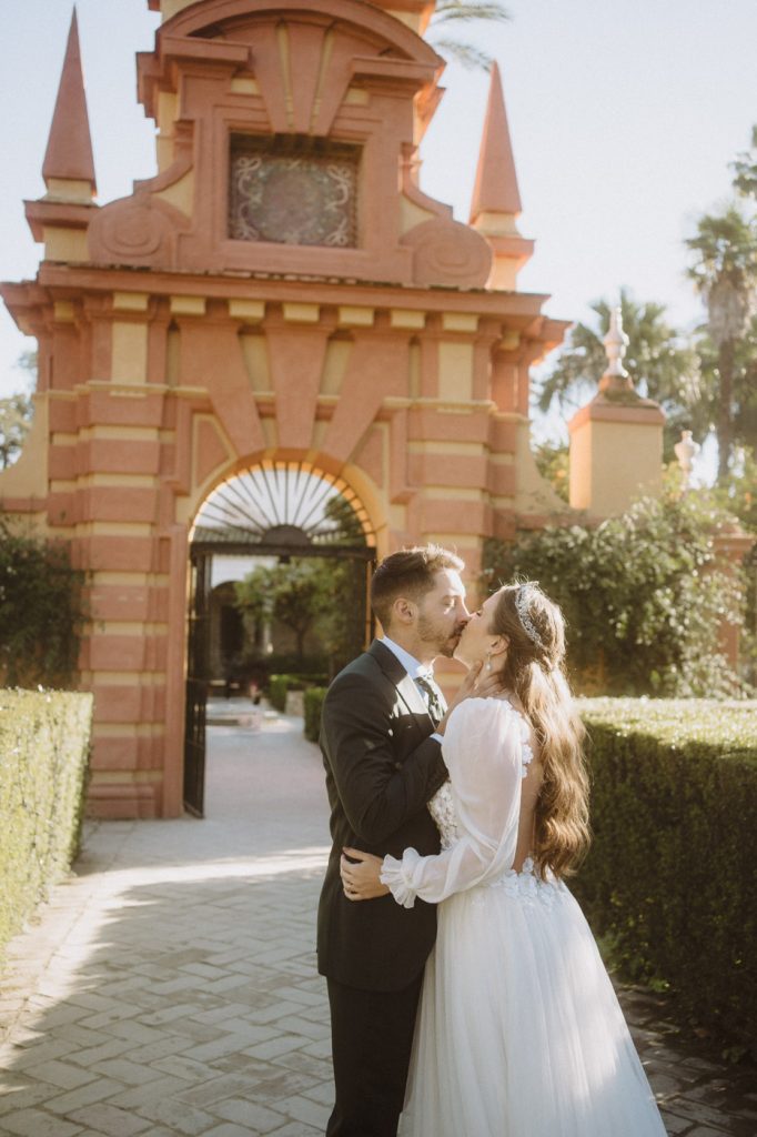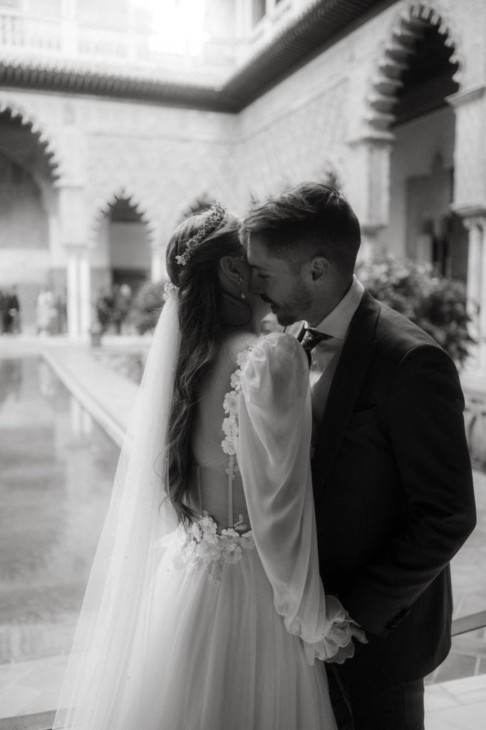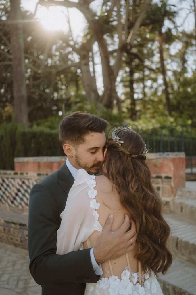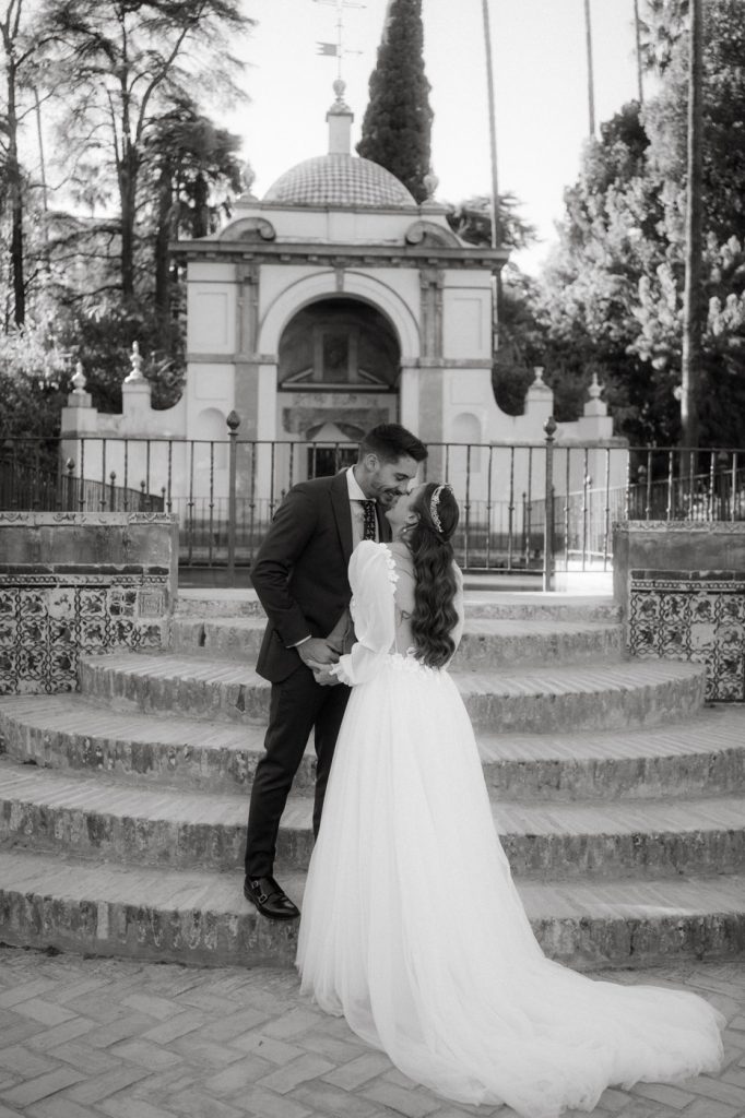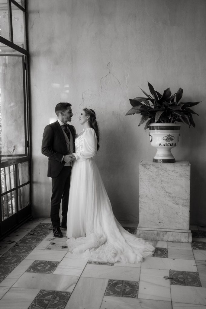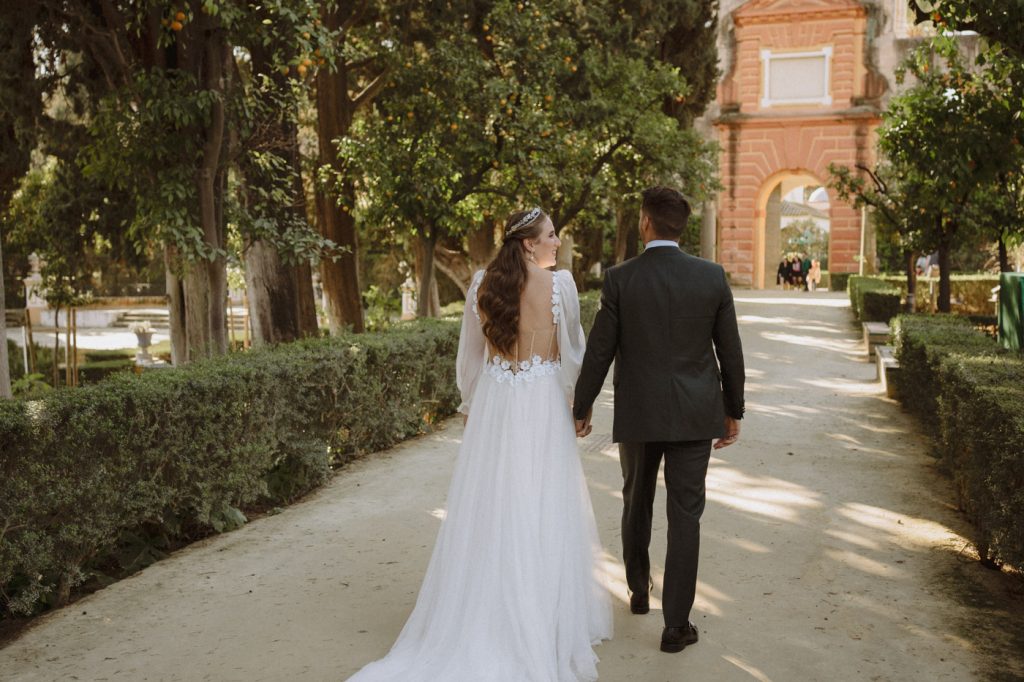 Mucha gente duda en si hacer postboda o no, la consideran prescindible, ya que el día de la boda ya tienen muchas fotos vestidos de novios y es verdad, pero no es lo mismo para nada. Pensad en el dineral que os gastáis en ese vestido y ese traje, para usarlos solo un día en la vida… menos incluso, unas horas. Además en la boda muchas veces tenemos muy poquito tiempo para fotos. Es normal, no queréis perderos mucho tiempo del cocktail porque quereis comer y estar con vuestros seres queridos, es comprensible. Además muchas veces la luz es la que toque y el entorno a veces puede ser demasiado limitado. Las postbodas merecen la pena porque os permite por un lado, volver a tener la oportunidad de lucir el vestido y el traje, (antes de guardarlo para la posteridad) y haceros fotos con total tranquilidad, en un sitio bonito de vuestra elección, a una hora en la que la luz va a ser perfecta para que salgan espectaculares. Es un recuerdo que sin duda merece la pena tener y salen fotones que os encantará tener. Si me preguntáis, la postboda es sin duda un rotundo SÍ. Y así lo demuestran las fotos de a continuación. Y encima si elegís el Alcazar de Sevilla como Alba y Javi, el éxito está asegurado, ya que es un sitio precioso y lleno de rincones fotogénicos.