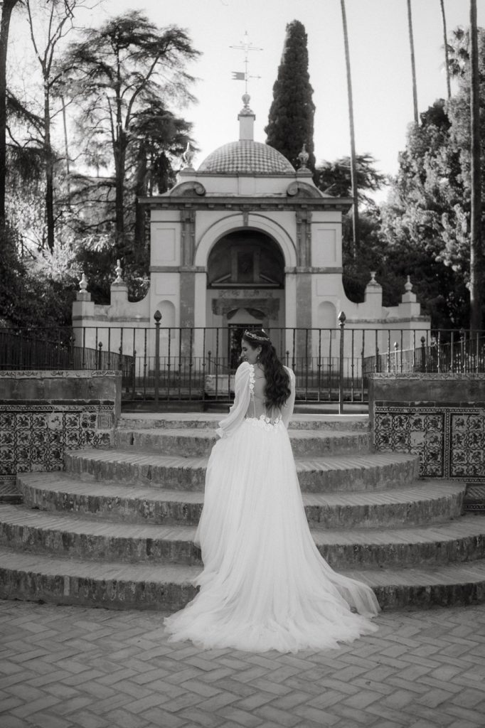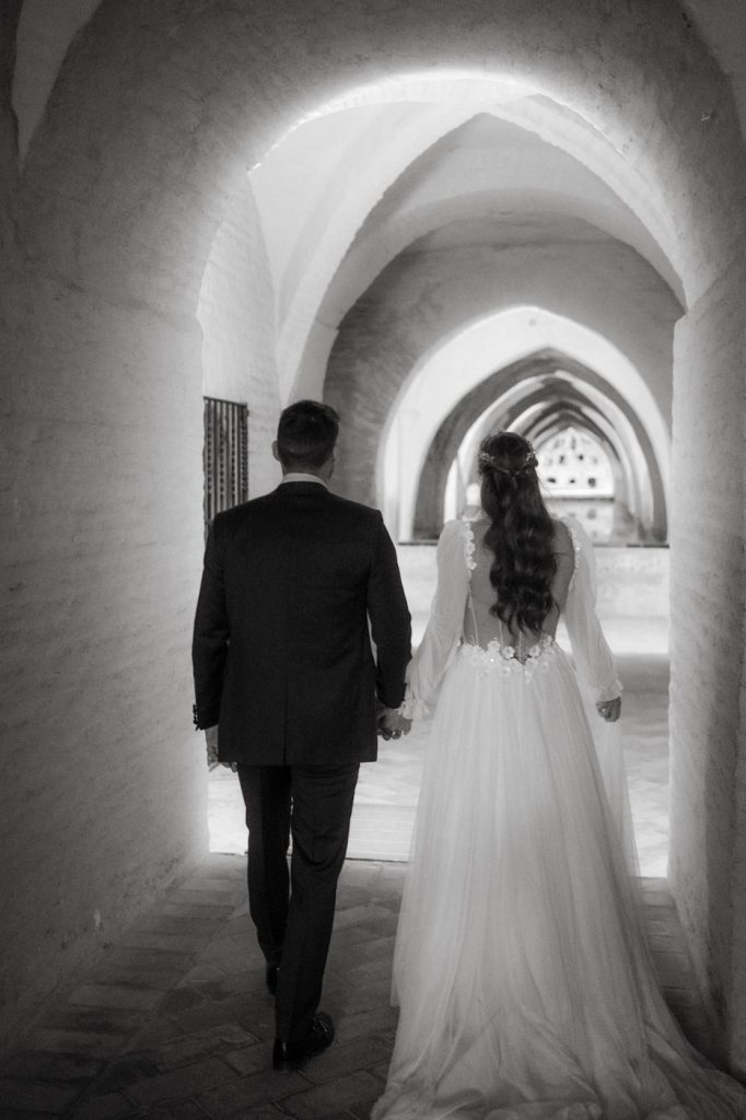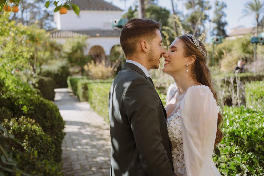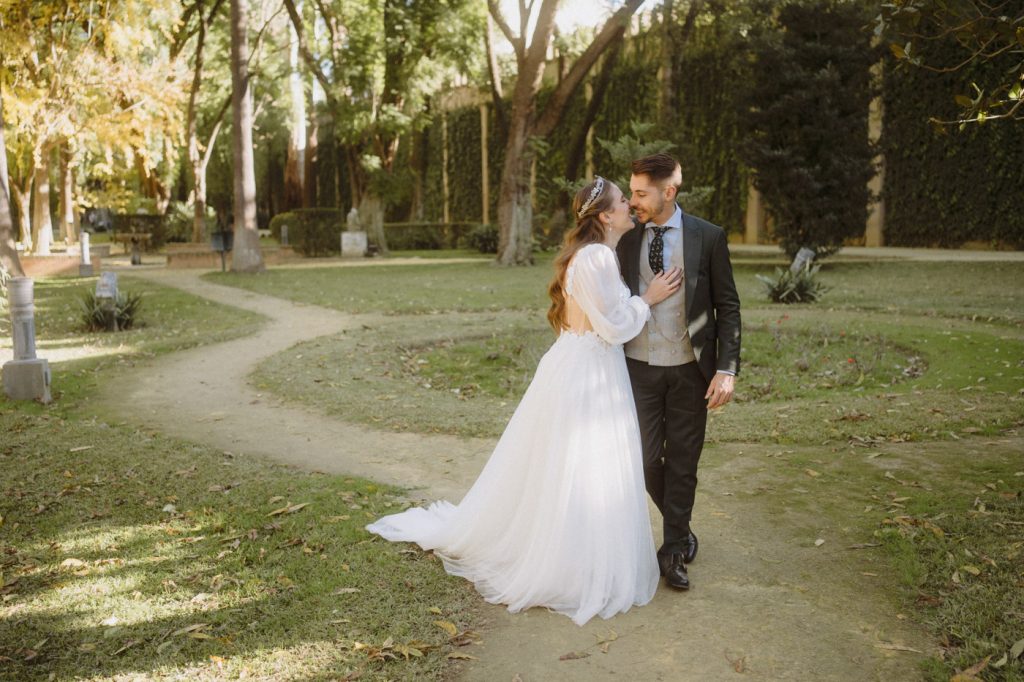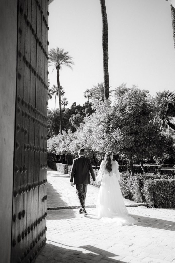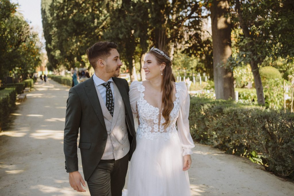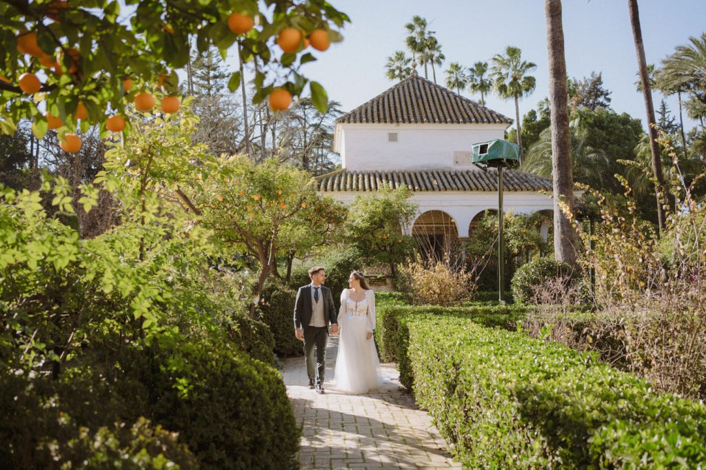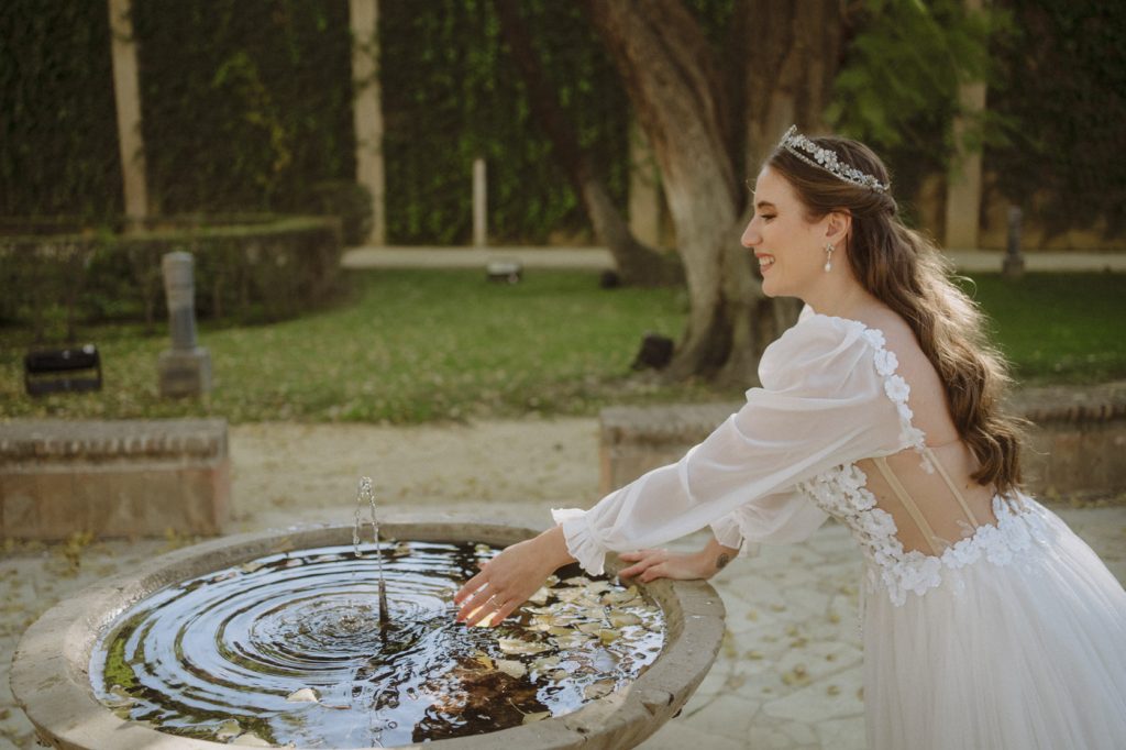 Mucha gente duda en si hacer postboda o no, la consideran prescindible, ya que el día de la boda ya tienen muchas fotos vestidos de novios y es verdad, pero no es lo mismo para nada. Pensad en el dineral que os gastáis en ese vestido y ese traje, para usarlos solo un día en la vida… menos incluso, unas horas. Además en la boda muchas veces tenemos muy poquito tiempo para fotos. Es normal, no queréis perderos mucho tiempo del cocktail porque quereis comer y estar con vuestros seres queridos, es comprensible. Además muchas veces la luz es la que toque y el entorno a veces puede ser demasiado limitado. Las postbodas merecen la pena porque os permite por un lado, volver a tener la oportunidad de lucir el vestido y el traje, (antes de guardarlo para la posteridad) y haceros fotos con total tranquilidad, en un sitio bonito de vuestra elección, a una hora en la que la luz va a ser perfecta para que salgan espectaculares. Es un recuerdo que sin duda merece la pena tener y salen fotones que os encantará tener. Si me preguntáis, la postboda es sin duda un rotundo SÍ. Y así lo demuestran las fotos de a continuación. Y encima si elegís el Alcazar de Sevilla como Alba y Javi, el éxito está asegurado, ya que es un sitio precioso y lleno de rincones fotogénicos.
