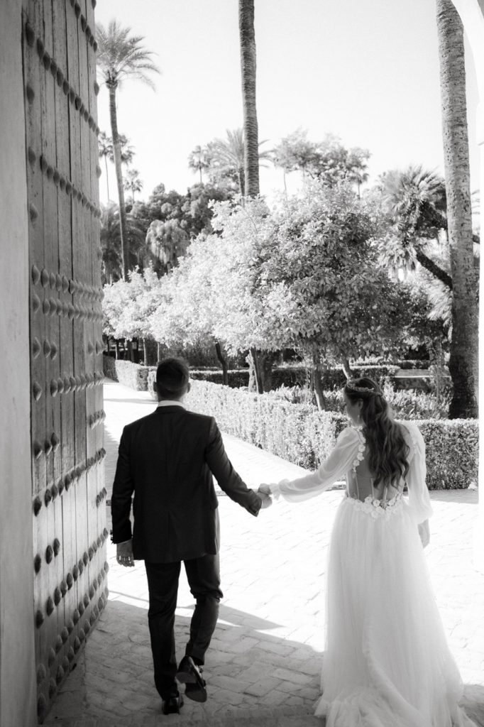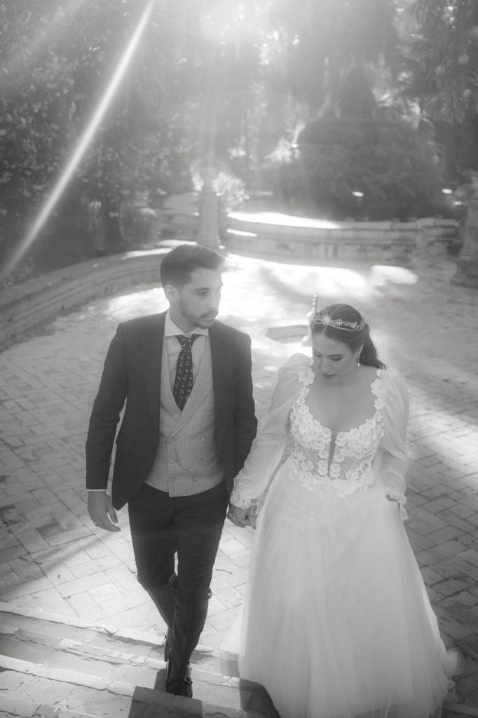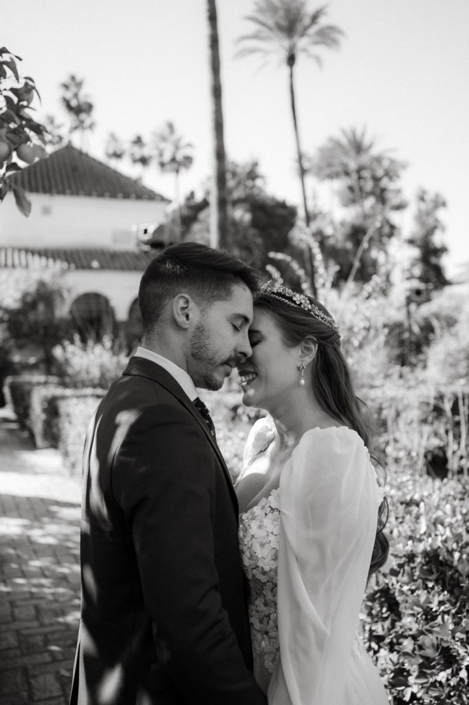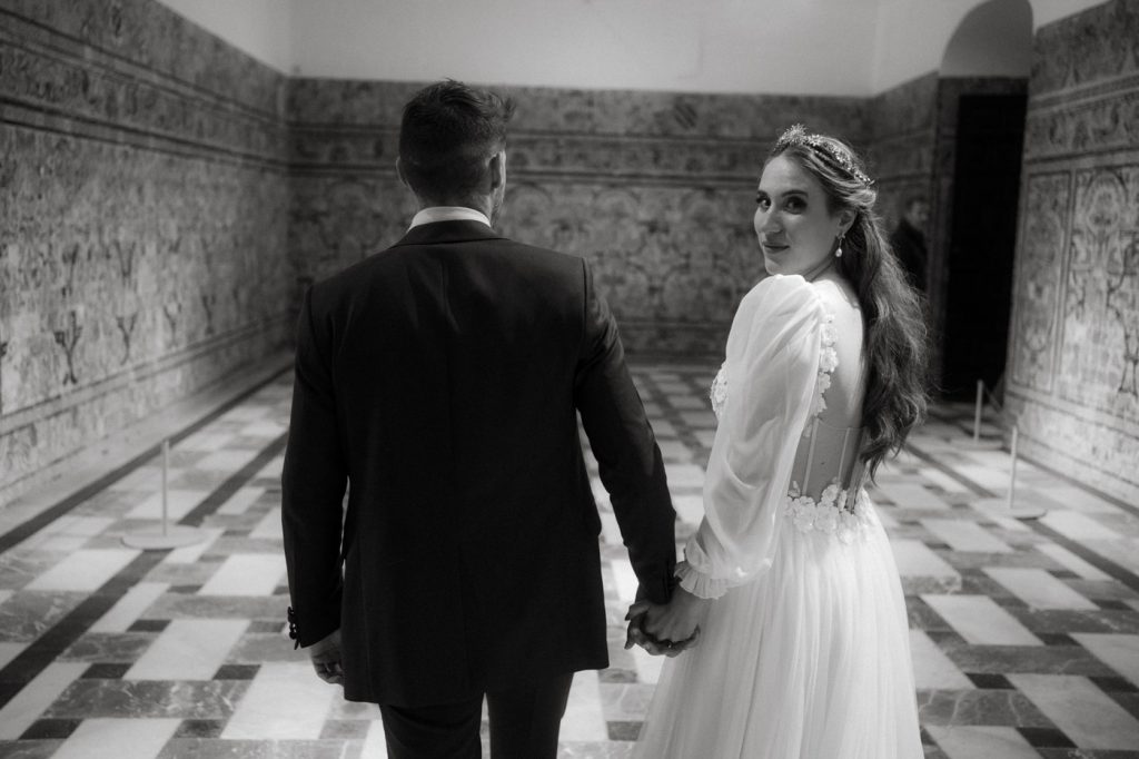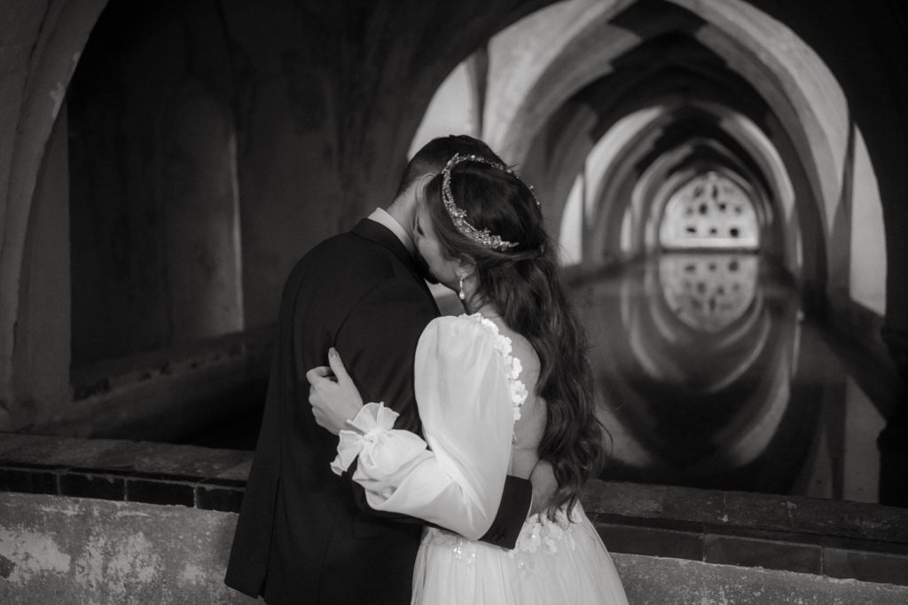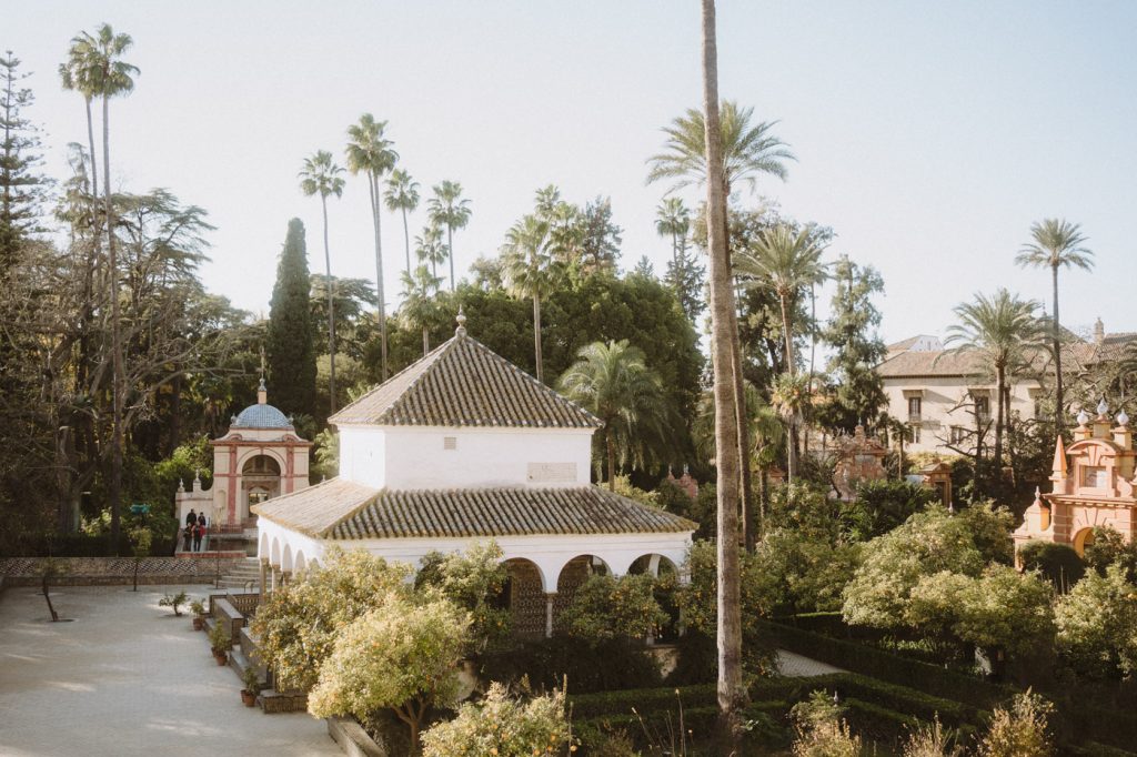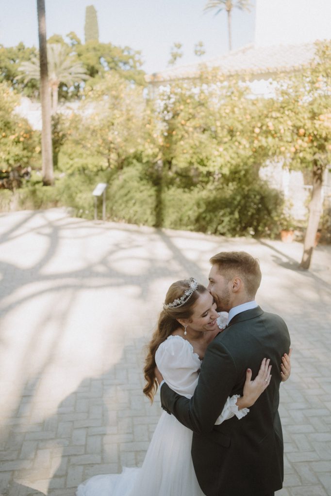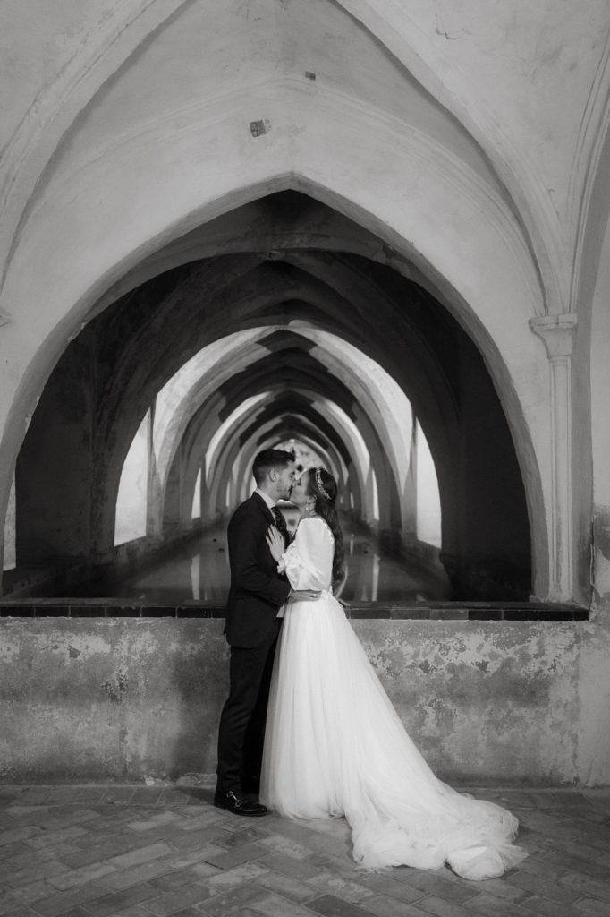 Mucha gente duda en si hacer postboda o no, la consideran prescindible, ya que el día de la boda ya tienen muchas fotos vestidos de novios y es verdad, pero no es lo mismo para nada. Pensad en el dineral que os gastáis en ese vestido y ese traje, para usarlos solo un día en la vida… menos incluso, unas horas. Además en la boda muchas veces tenemos muy poquito tiempo para fotos. Es normal, no queréis perderos mucho tiempo del cocktail porque quereis comer y estar con vuestros seres queridos, es comprensible. Además muchas veces la luz es la que toque y el entorno a veces puede ser demasiado limitado. Las postbodas merecen la pena porque os permite por un lado, volver a tener la oportunidad de lucir el vestido y el traje, (antes de guardarlo para la posteridad) y haceros fotos con total tranquilidad, en un sitio bonito de vuestra elección, a una hora en la que la luz va a ser perfecta para que salgan espectaculares. Es un recuerdo que sin duda merece la pena tener y salen fotones que os encantará tener. Si me preguntáis, la postboda es sin duda un rotundo SÍ. Y así lo demuestran las fotos de a continuación. Y encima si elegís el Alcazar de Sevilla como Alba y Javi, el éxito está asegurado, ya que es un sitio precioso y lleno de rincones fotogénicos.