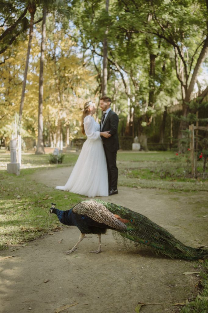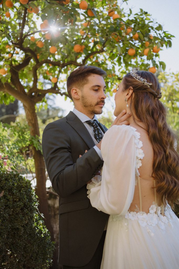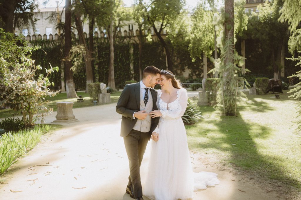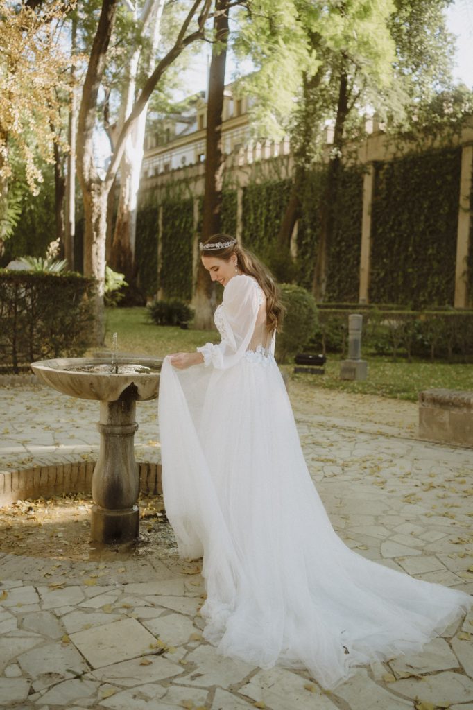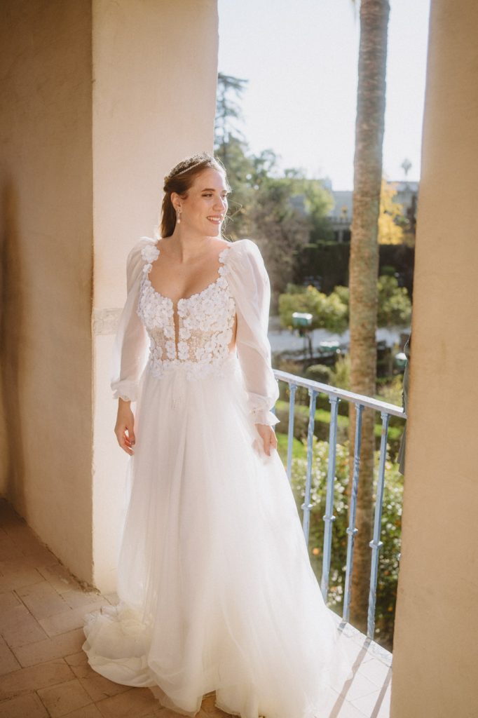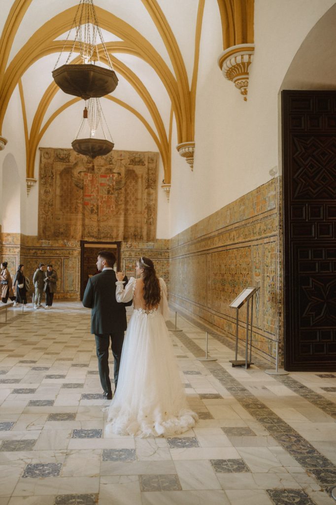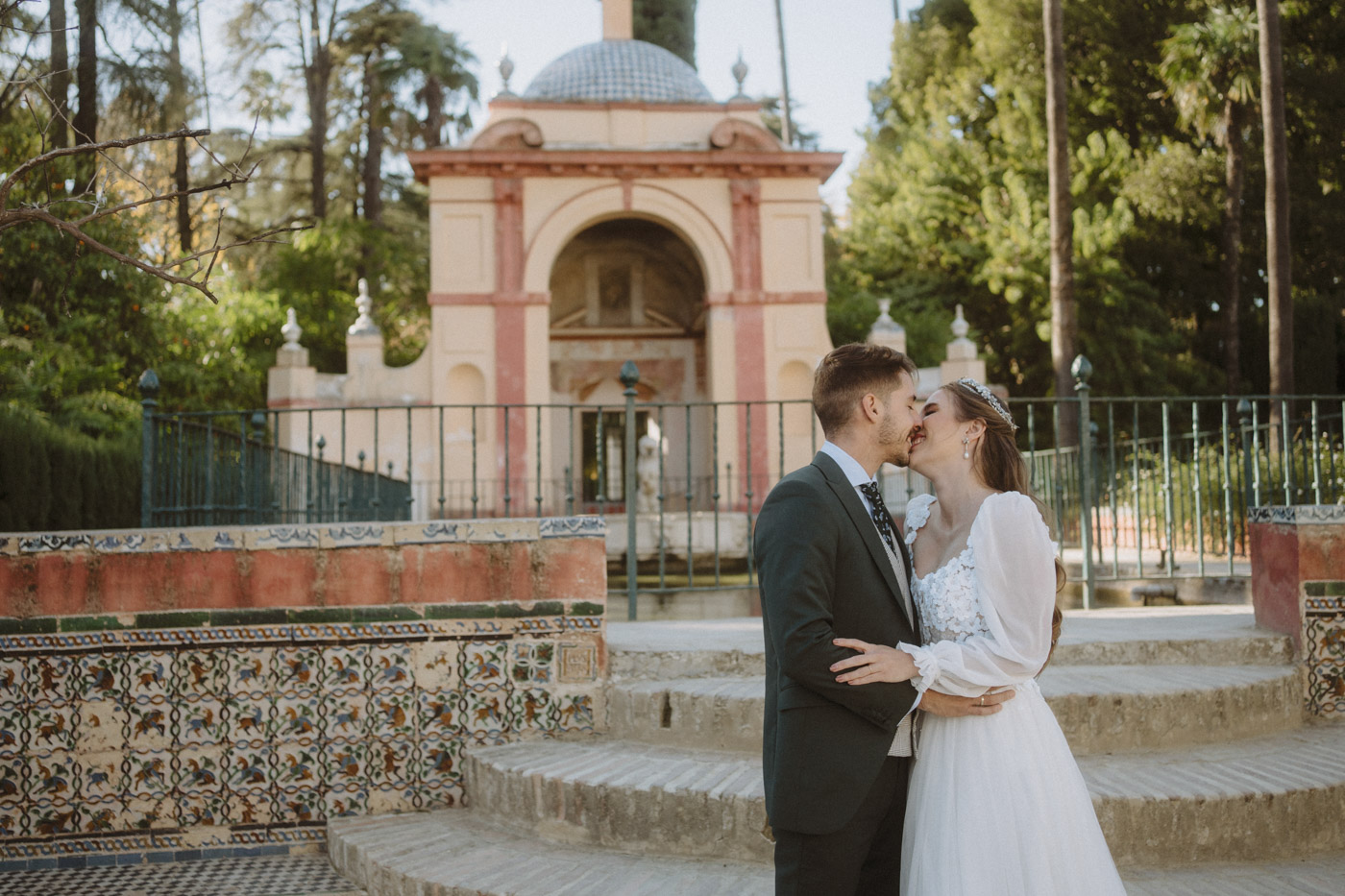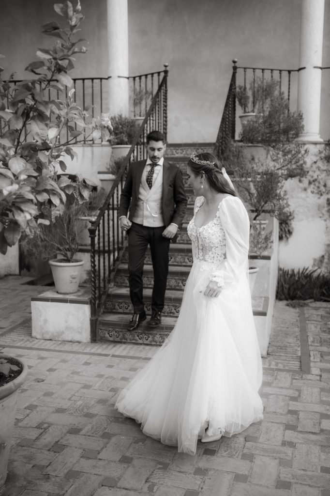 Mucha gente duda en si hacer postboda o no, la consideran prescindible, ya que el día de la boda ya tienen muchas fotos vestidos de novios y es verdad, pero no es lo mismo para nada. Pensad en el dineral que os gastáis en ese vestido y ese traje, para usarlos solo un día en la vida… menos incluso, unas horas. Además en la boda muchas veces tenemos muy poquito tiempo para fotos. Es normal, no queréis perderos mucho tiempo del cocktail porque quereis comer y estar con vuestros seres queridos, es comprensible. Además muchas veces la luz es la que toque y el entorno a veces puede ser demasiado limitado. Las postbodas merecen la pena porque os permite por un lado, volver a tener la oportunidad de lucir el vestido y el traje, (antes de guardarlo para la posteridad) y haceros fotos con total tranquilidad, en un sitio bonito de vuestra elección, a una hora en la que la luz va a ser perfecta para que salgan espectaculares. Es un recuerdo que sin duda merece la pena tener y salen fotones que os encantará tener. Si me preguntáis, la postboda es sin duda un rotundo SÍ. Y así lo demuestran las fotos de a continuación. Y encima si elegís el Alcazar de Sevilla como Alba y Javi, el éxito está asegurado, ya que es un sitio precioso y lleno de rincones fotogénicos.